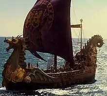 There are 1,400 special effects shots that were made for The Voyage of the Dawn Treader,[31] more than The Lion, the Witch and the Wardrobe's 800 and fewer than Prince Caspian's 1,500 shots. Angus Bickerton served as the lead visual effects supervisor of the film while Jim Rygiel, who supervised the effects on The Lord of the Rings film trilogy, worked as the senior visual effects supervisor.[32] British visual effects companies the Moving Picture Company, Framestore CFC, and The Senate VFX were hired to create the visual effects alongside Cinesite and The Mill.[33] Moving Picture worked on the dragon Eustace and the Dawn Treader. They say the dragon is "amongst the most heroic characters ever created, and is scheduled to be featured in around 200 shots of the movie." They also revised Reepicheep from the previous film by saturating his color, giving him bushier eyebrows and ear hair, and made his whiskers a little more wiry just to give him a sense of age. Framestore also revised Aslan, changing his color palette to be a more realistic lion than a golden lion and adding a darker mane; they also created 16 different dufflepuds to replace Jonathan Fawkner and Angus Bickerton running around first as dufflepuds on the set; The Senate worked on the opening shot of King's College, Cambridge, as well as the star effect on Liliandil at Ramandu's Island; Cinesite worked on the Dark Island, and Fugitive Studios did the end titles and credits, which featured original drawings created by Pauline Baynes for the Narnia books.[32] These illustrations were included because the film's creators wanted the credits to have visual interest, and also because they wished to include an acknowledgement to Pauline Baynes, who died in August 2008.[34]
