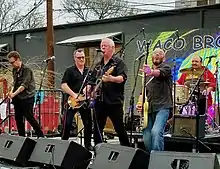 For their first albums, the Waco Brothers included Dean Schlabowske (guitar/vocal), Tracey Dear (mandolin/vocal), Alan Doughty (bass/vocal), Mark Durante (pedal steel guitar), and Mekons drummer Steve Goulding). Joe Camarillo (drums) often filled in for Goulding, who had moved to New York City.[6] By 2015, Camarillo had fully replaced Goulding, and Durante had left. Camarillo died of complications of congenital cardiac disease in January, 2021, after surviving COVID-19.[7][8][9] Dan Massey, who had previously substituted on drums whenever Camarillo had been unavailable, became the Waco Brothers permanent new drummer, starting with the band's 2021 concerts. Jean Cook, who had played violin intermittently with the band for years, officially joined the band in 2020.[10][11]