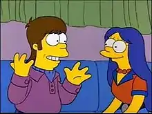 The television show that the Simpson family watches at the beginning of the episode, in which the two reviewers discuss the latest McBain film, is a parody of the American television series Siskel & Ebert & the Movies.[11] In the flashback sequence, Homer is seen singing along to the 1973 song "The Joker" by the Steve Miller Band while driving to school, which he also sings during the end credits.[12] Pink Floyd and Led Zeppelin posters hang on the wall of Homer's 1974 bedroom.[11] The 1970 song "(They Long to Be) Close to You" by The Carpenters is heard when Homer sees Marge for the first time.[1] Homer eats a bucket of Shakespeare Fried Chicken when he reveals his feelings towards Marge to Grampa. At the debate, Homer disagrees about the idea of lowering the United States national speed limit to 55 mph (89 km/h), arguing that "Sure, it'll save a few lives, but millions will be late!" This is a reference to the National Maximum Speed Law provision of the 1974 Emergency Highway Energy Conservation Act, which (at the time) prohibited speed limits higher than 55 everywhere.[11] Barney asks a girl named Estelle if she wants to go to the prom with him, but she tells him she would not go to the prom with him even if he were American actor Elliott Gould.[11] Artie says he can think of a dozen highly cogent arguments to why Marge should accept his prom offer, one of which is from a Time magazine titled "America's Love Affair with the Prom: Even wallflowers can look forward to one date a year," a reference to the American magazine Time.[11] Songs played in the episode include "The Streak" by Ray Stevens, "Goodbye Yellow Brick Road" by Elton John,[13] "Colour My World" by Chicago,[14] "Pick Up the Pieces" by Average White Band,[13] and "The Hustle" by Van McCoy.[1] Marge's car is an AMC Gremlin.