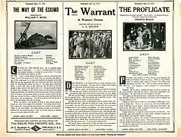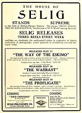- ↑ Image of Selig promotional flyer for Lost in the Arctic, image "File:Release flier for LOST IN THE ARCTIC, 1911.jpg", Wikipedia Commons. Retrieved May 29, 2020.