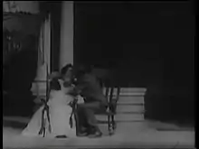 5. Other view of the veranda. The man and the widow are sitting alone. He kisses her.