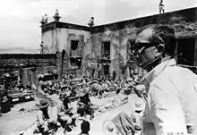 Pike rides off with the only survivors: his close friend Dutch Engstrom, brothers Lyle and Tector Gorch, the inexperienced Angel, and a fifth man blinded and mortally wounded by buckshot, who Pike mercy-kills. The loot from the robbery turns out to be worthless steel washers planted by Harrigan. Needing money, they head for Mexico accompanied by the cantankerous Freddie Sykes and cross the Rio Grande to the rural village where Angel was born. The village elder warns them about General Mapache, a vicious Huertista officer in the Mexican Federal Army, who has been stealing food and animals from local villages to support his campaign against the forces of Pancho Villa.