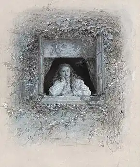 In August 1867, Tennyson had revised the words, and they were printed privately by Sir Ivor Guest.[4] But Tennyson refused to allow publication until November 1870, when he finally agreed. By this time, however, Millais had sold the drawings he had prepared, except for one, and he was too busy to work any further on the project.[5]