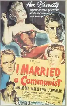 The Woman on Pier 13 is a 1949 American film noir drama directed by Robert Stevenson and starring Laraine Day, Robert Ryan, and John Agar.[2] It previewed in Los Angeles and San Francisco in 1949 under the title I Married a Communist but, owing to poor polling among preview audiences, this was dropped prior to its 1950 release.[1][3]