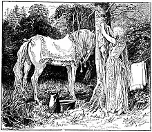 All this is done, and she resumes her human shape; but not liking to be seen naked, she turns into a spinning wheel, a washing-vat, and a spindle, all of which her husband destroys till she becomes human again. On their return to the castle, he orders a huge fire to be made under the bath with tar, and its approach to be covered with brown and blue cloth. Then he invites the witch's daughter to take a bath. She and her mother, in stepping over the cloth, fall a depth of three fathoms into the fire and tar to their death. The dying witch puts a curse on all mankind.[1]