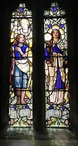 The church underwent a major refurbishing during the period 1908 - 1912, and one of the major additions was the installation of a new wooden organ casing, choir pews, reredos and archway to the chancel, as well as other works, all carved by Alec Miller of the Chipping Camden Guild.[33] These are greatly admired and rightly so. The inscription at the bottom of the left-hand light reads, "And the weak things of the world hath GOD chosen that he may confound the strong." (Corinthians 1-27),[34] and that at the bottom of the right-hand light reads "And I went mourning, “No fair Hebrew boy shall smile away my maiden blame among the Hebrew mothers.” this being a quotation from Tennyson.[35][36][37]