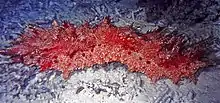 Thelenota rubralineata has an elongated, roughly trapezoidal body 30 to 39 cm long and 8 cm wide in its uncontracted state.[3] Like other Thelenota, it has well marked differences between its ventral and dorsal surface, with papillae and pedicels covering its dorsal surface, and numerous podia scattered randomly on its ventral surface. The dorsal protrusions are arranged in two rows of 13 to 15 large, conical arms, many of which ending in spiked papillae. The sides of the body are also covered in a continuous row of multipapillate protrusions, with smaller outgrowths distributed randomly over the body.[3]