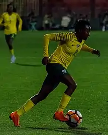 Kgatlana represented her country at the 2016 Summer Olympics[17] and the 2018 Africa Women Cup of Nations, where she won the Player of the Tournament and was the highest goal scorer.[18] She also represented South Africa at the 2019 FIFA Women's World Cup in France, where she scored her country's first goal ever in the tournament. On 2 August 2023, she scored the winning goal in a 3–2 victory over Italy in the 2023 FIFA Women's World Cup last group stage match, to be her country's first ever win in the competition which led to their qualification to the knockout phase.[19]