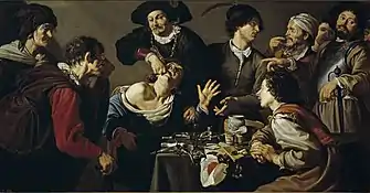 Theodoor Rombouts (2 July 1597 – 14 September 1637) was a Flemish painter who is mainly known for his Caravaggesque genre scenes depicting lively dramatic gatherings as well as religiously-themed works.[1] He is considered to be the primary and most original representative of Flemish Caravaggism. These Caravaggisti were part of an international movement of European artists who interpreted the work of Caravaggio and the followers of Caravaggio in a personal manner.[2]