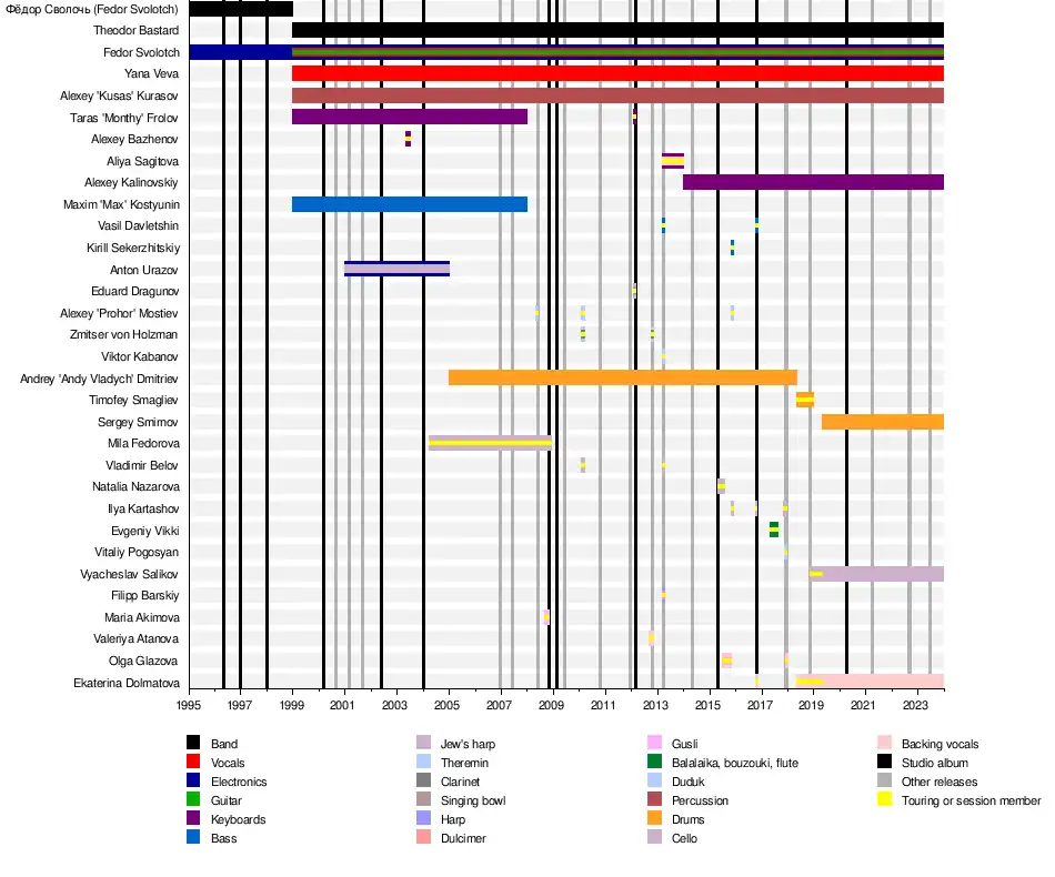 The band was founded in 1995 by Alexander Starostin – guitarist and composer – as a solo project. His stage name is Fedor Svolotch and the birth name of the band was the same. More members joined the band later, in 2000's, including vocalist and composer Yana Veva who also later participated in Shiva in Exile.[2] In 1999 the band's name became Theodor Bastard as the English translation of the stage name 'Fedor Svolotch'.
