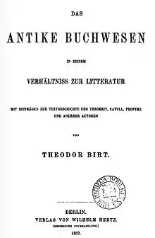 Many of Birt's theories and interpretations are dated and have been superseded by later research, but he permanently broadened and deepened the methodologies used in histories of the ancient book.[10]