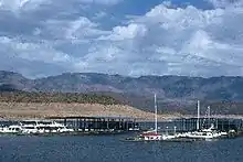 Theodore Roosevelt Lake (usually called Roosevelt Lake, sometimes Lake Roosevelt) is a large reservoir formed by Theodore Roosevelt Dam on the Salt River in Arizona as part of the Salt River Project (SRP). Located roughly 80 miles (130 km) northeast of Phoenix in the Salt River Valley, Theodore Roosevelt is the largest lake or reservoir located entirely within the state of Arizona (Lake Mead and Lake Powell are larger but are both located partially within the bordering states of Nevada and Utah respectively). The reservoir and the masonry dam that created it, Roosevelt Dam, were both named after U.S. President Theodore Roosevelt who dedicated the dam himself on March 18, 1911.[4] Roosevelt Lake is a popular recreation destination within the Tonto National Forest; the facilities located at this lake are managed by that authority.