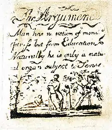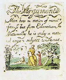 | Plate a3 (Argument) | ![]() | The Argument Man has no notion of moral fitness but from education Naturally he is only a natu- ral organ subject to Sense. | In the main picture, a woman is seated in a chair. Her legs are crossed and she holds a book, from which she appears to be reading. On the right stands a young girl, also holding a book from which she reads. On the left, a young boy is lying on the ground with his torso propped up on his left elbow. He too appears to be reading. Numerous tiny figures can also be seen in the vicinity of the words "The Argument". Furthest on the left, a figure leans against the vertical of the "T" in "The". Moving to the right, another figure, possibly winged, hovers above the space between "The" and "Argument". Next, a figure leans against the left diagonal of the "A". Another figure stands by the right diagonal of the "A" reaching up to the right towards a bird above the "u" and "m." Additionally, the first and last letters of the heading expand out into vines, as does the final "n" in "Education" in the main text.[36] | From Copy G. Three of the six original impressions of this plate are in colour (from Copies C, G and M; although all three differ from one another in their colouration), and three are in monochrome (from Copies A, B and D). The picture is probably a symbolic depiction of the education mentioned in the text. However, even here, Blake introduces a sense of contrariness, as the figures mingled amongst the text "may suggest a source of education more energetic and spiritual than can be provided by the books and vegetation below."[37] |