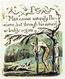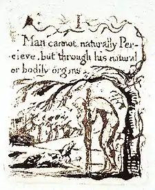 | Plate a4 (I) | ![]() | I Man cannot naturally Per- cieve, but through his natural or bodily organs | An old man, naked, leans on a walking stick and looks down at a dog on the ground, which looks up at him. In the background can be seen a hill and a clump of trees. A tree also grows on the right margin, a branch of which forms a canopy over the old man. Another branch extends to the top of the plate and separates the heading and the first line of text. At the far end of this branch, sits a tiny human figure, with a number of birds flying above him. | From Copy G. Three of the six original impressions of this plate are in colour (from Copies C, G and M; although all three differ from one another in their colouration), and three are in monochrome (from Copies A, B and D). The image is a metaphorical depiction of the text, with the old man perceiving through his bodily organs (his eyes). The dog may carry the symbolic association that Man's organic perceptions are no better or different than animals', i.e. if Man limits himself to his organic senses and adheres to the principals of Empiricism, he is no different, or better, than a mere animal; it is only by the acceptance of the spiritual and the imagination, faculties unavailable to animals and unique to Man, that he can rise above a strictly physical existence.[38] Blake would return to this concept in the planographic print Nebuchadnezzar (c.1795/1805). The posture of the man is based on a centurion in Raphael's Deliverance of Saint Peter (1514).[37] As in the previous plate, with the small figures interacting with the text, "Blake has established an opposition between limited perceptions on the ground below the text and livlier, freer motifs above."[37] |