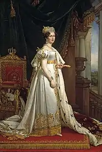During her husband's reign as king of Bavaria, Therese showed interest in state affairs and was considered a political companion to her husband.[5] Whenever Ludwig was away from Munich, she would inform him about court and country events. In March of 1830, she collected newspaper articles from both the French Journal de Débats and various German newspapers in order to bring Ludwig's attention to the emerging July Revolution. She believed that the king should know everything that was going on in his country. She also kept their son Otto, who was in Greece, informed about political events going on back home. When Otto was elected King of Greece in 1832, she urged her husband to consult and listen to Otto on the matter. Further, she warned Ludwig I about the scholar Friedrich Thiersch whom she considered too liberal, and the painter Karl Wilhelm von Heydeck, whom she considered unpopular in Greece.[6]