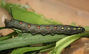Larva is pale purplish brown. There is a yellow subdorsal line and white spots with a pale lateral line below them on the thoracic somites. Black-ringed ocelli can be seen on 4th to 10th somites, where the first two centered with blue, and posterior with purple. In the early instars, posterior ocelli are centered with crimson color with dorsal bands of yellow specks.[3] The species is found in open lowland habitats.[4] As the caterpillar crawls, it sweeps the tail-like horn, which is black and tipped in white, in an arc forwards and back.