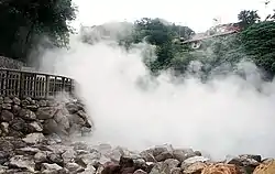The Thermal Valley (Chinese: 地獄谷; pinyin: Dìyù Gǔ) is a valley located on the foothill of Yangmingshan National Park in Beitou District, Taipei, Taiwan. This makes Thermal Valley one of the sources of acidic sulfur hot spring in the area. Locals also sometimes refer to it as Hell Valley. The formula of this mineral water contains Plaster, Alunite, Jarosite, Realgar, Sulfur, and Radium. pH value is between 1.4~1.6, the highest temperature could be reached to 90 Celsius. It was one of the eight attractions and twelve scenic spots in Taiwan during the Japanese colonial period.[1]