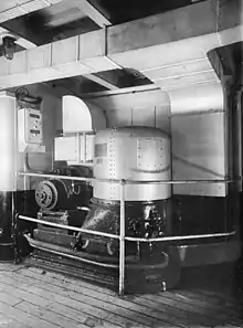 A 'tween deck' Thermotank as seen fitted onboard RMS Lusitania in 1907. Note the trunking running up from the Thermotank and across the deck head.