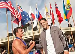 At the 2004 FINA World Swimming Championships (25 m) in Indianapolis, Pereira won the gold medal in the 200-meter individual medley with a time of 1:55.78, defeating Ryan Lochte[26] and breaking the South American record.[27] In the 4×100-meter freestyle, he won a silver medal[28] and he also won two bronze medals in the 100-meter individual medley[29] and 4×200-meter freestyle,[30] beating the South American record with a time of 7:06.64.[31]