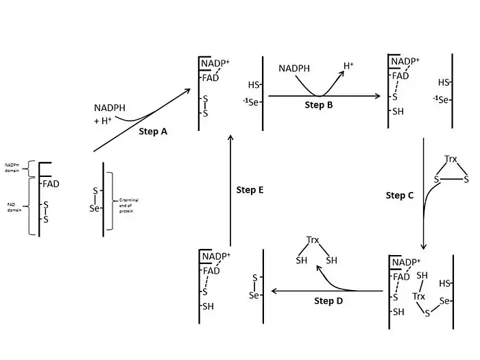 - ↑ Zhong L, Arnér ES, Holmgren A (May 2000). "Structure and mechanism of mammalian thioredoxin reductase: the active site is a redox-active selenolthiol/selenenylsulfide formed from the conserved cysteine-selenocysteine sequence". Proceedings of the National Academy of Sciences of the United States of America. 97 (11): 5854–9. Bibcode:2000PNAS...97.5854Z. doi:10.1073/pnas.100114897. PMC 18523. PMID 10801974.