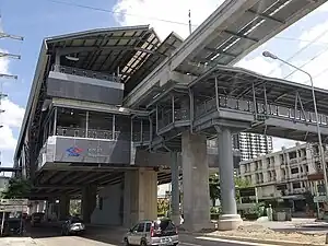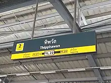 Thipphawan station (Thai: สถานีทิพวัล, pronounced [sā.tʰǎː.nīː tʰíp.pʰā.wān]) is a Bangkok MRT station on the Yellow Line. The station is located on Thepharak road in Samut Prakan Province and is named after the Thipphawan Housing Community located adjacent to the station.[1] The station has four entrances.[2] It opened on 3 June 2023 as part of trial operations on the line between Samrong and Hua Mak.[3]