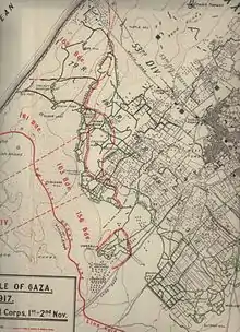 Meanwhile, preparations for the main attacks on the Gaza line at Hareira and Sharia, began on 1 November when the 53rd (Welsh) Division, with the Imperial Camel Brigade on the right, advanced northwards to occupy a line 3 miles (4.8 km) to the west without opposition. This placed the infantry in a position from which they could cover the right flank of the proposed attack by the XX Corps on Hareira and Sheria.[6][16]