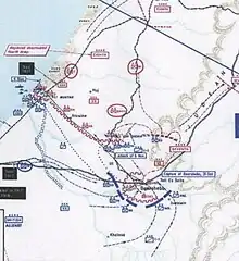 The second phase began at 03:00 on 2 November when the 156th Brigade of the 52nd (Lowland) Division launched the first attack on the El Arish Redoubt.[37][38][50][52] This attack was aimed at breaking the line of defensive fortifications consisting of three groups of trench complexes and redoubts. These were the El Arish, Rafa, and Cricket redoubts, which were connected by a "series of trench lines several layers thick, and backed by other trenches and strong points" stretching two miles (3.2 km) along the seaward defences to the west of Umbrella Hill.[53] The attack on El Arish redoubt was to be supported by two of the six available tanks of the Palestine Tank Detachment's eight tanks.[54][Note 7]