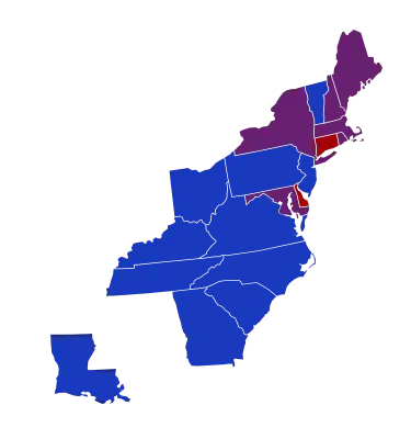 ![]() Senators' party membership by state at the opening of the 13th Congress in March 1813.