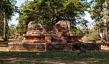 Thma Bay Kaek (Khmer: ប្រាសាទថ្មបាយក្អែក) is located at Angkor in Cambodia. It consists of the ruins of a square brick tower facing east and is preceded by a laterite terrace. This is all that remains of this temple which must be one of many that originally surrounded the Bakheng. A sacred treasure consisting of five gold leaves arranged in a quincunx, the central leaf of which carried the image of Nandi, was found here.[1]