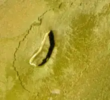 Thomagata Patera is a volcano on Jupiter's moon Io. It is located on Io's anti-Jupiter hemisphere at 25°40′N 165°56′W / 25.67°N 165.94°W[1], to the east of the nearby active volcanoes Volund and Zamama. Thomagata is a kidney-shaped Ionian patera, a type of volcanic crater similar to a caldera, 56 kilometers (35 mi) long, 26 km (16 mi) wide, and 1.2–1.6 km (0.7–1.0 mi) deep.[2] The volcano is currently inactive as a thermal hotspot has never been observed at Thomagata and the bright floor of the patera suggests that it is cold enough for sulfur dioxide and sulfur to condense.[3] Thomagata is located near the center of a low, 100 km (62 mi) wide mesa. The edge of the mesa rises 200 meters (660 ft) above the surrounding plains, however the slope up to the edge of Thomagata Patera is unknown. If the floor of the patera is at the same level as the surrounding plains, the western slope of the mesa would have a grade of 2°.[2] The morphology of this mesa and the pattern of faded lava flows along its slopes radiating away from Thomagata (at least on its eastern side) suggest that Thomagata Patera and the mesa that surrounds it may be a shield volcano, also called a tholus on Io.[3] The irregular margin of the mesa and the lack of debris at the base of its basal scarp suggest that it was modified by sulfur dioxide sapping.[3]