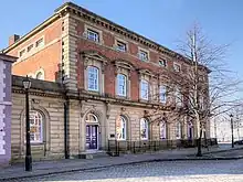 This is a grade II* listed building,[87] and the subject of a conversion by Sorby.[32] It was originally a house designed by Nicholas Hawksmoor for Mr Eastland Hawksmore in the Beast Market, Gainsborough, Lincolnshire, in 1759. In 1871, Sorby converted it into a county court and offices, with the court entrances facing Beaumont Street. Hawksmoor's design had originally been "a large square brick building [in 18th-century style], with square windows and doors, and gauged brick strings and arches". Sorby made major changes to the structure.[88][89] The Building News described the new works:[90]