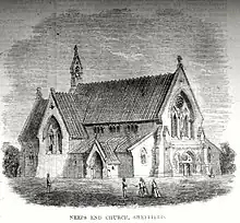 St Michael and All Angels, Neepsend, was consecrated in November 1867.[53] It was built for the Church Extension Society,[2] in an area with a background of severe flood, poverty, dirt and smoke, and was "therefore ... very plain in character". The nave was 90 ft (27 m) long, and 60 ft (18 m) wide, including the aisles, and contained seating for 1,000. The font, the carving and the heating apparatus were gifts from local worthies. The Illustrated London News said:[53]