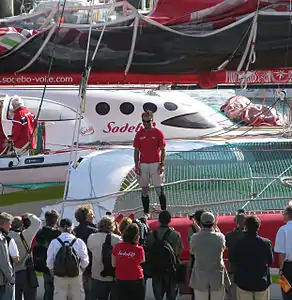 Thomas Coville on trimaran Sodebo arriving in Brest, France the 15th of July 2008.