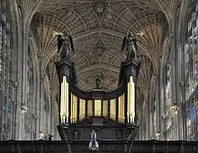 Dallam afterwards built many important organs, including that of King's College Chapel, Cambridge. In 1616 he supplied an organ for the Chapel Royal at Holyrood Palace.[6] Unfortunately, much of his work was destroyed by people hostile to church organs following the outbreak of the English Civil War. In the case of King's College Chapel, the existing instrument is the product of successive rebuilds, and it is not known for certain whether it contains any of Dallam's work, but it is believed that some of the case is his.