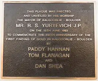 Official Western Australian recognition for the prospecting skills of Hannan and partners began to emerge in the year following the find, with the grant of two blocks of land in Kalgoorlie in 1894. Then in 1904 small life pensions were accorded to Hannan and Shea (Flanagan no longer being alive). And thereafter on notable anniversaries of the find (25th, 50th, 100th) official ceremonies and plaques eventuated.