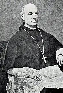 On March 15, 1875, he was appointed the fourth Bishop of Hartford, Connecticut, by Pope Pius IX.[1] Unwilling to abandon the consecrated life, he sent the Rome his declination of the appointment on the following April 19, but Rome did not accept and required him to obey on February 17, 1876.[2] Galberry received his episcopal consecration on the following March 19 from Archbishop John Joseph Williams, with Bishops Patrick Thomas O'Reilly and Edgar Philip Prindle Wadhams serving as co-consecrators, at St. Peter's Church in Hartford.[6] He designated St. Peter's to serve temporarily as his pro-cathedral while St. Joseph's Cathedral was under construction.[7] He later laid the cornerstone for St. Joseph's in April 1877.[8]