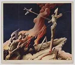 During World War II, Benton created a series titled The Year of Peril, which portrayed the threat to American ideals by fascism and Nazism. The prints were widely distributed. Following the war, Regionalism fell from favor, eclipsed by the rise of Abstract Expressionism.[39] Benton remained active for another 30 years, but his work included less contemporary social commentary and portrayed pre-industrial farmlands.