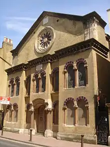 In 1874, Lainson received the commission for another religious building: a new synagogue for Brighton's large Jewish community, whose first place of worship had been founded in 1792.[16] A site on Middle Street in The Lanes was found, and the Sassoon family donated money to fund Lainson's elaborate Neo-Byzantine/Italian Romanesque Revival design, which was opened (as Middle Street Synagogue) in 1875.[17][18] Lainson won the commission in competition; it was unusual for a non-Jew to design synagogues, but no Jewish architects submitted any plans.[1][19]