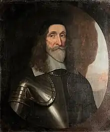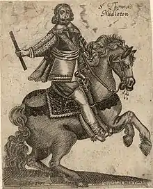 The outbreak of the First English Civil War in 1642 saw him sent to enforce the Militia Ordinance in Denbighshire, where many of the local gentry were Royalist.[2] In August the county presented a petition to the King for "protection against the orders and ordinances of Parliament" along with a regiment of volunteers and £1000;[3] on Charles's orders Chirk was attacked in Myddelton's absence, the following January, by local Royalist commander Robert Ellice, who installed a garrison and requisitioned Myddelton's money and plate to fund a foot regiment.[2] The loss of his property is supposed to have antagonised Myddelton enough to turn "a moderate politician into an active fighting man".[4]