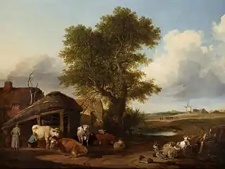 Thomas Peploe Wood was born in Great Haywood, Staffordshire the son of Joseph and Alethea Wood. Joseph Wood was a toll gate keeper and shoemaker. He was largely self-taught, but was encouraged by local architect Thomas Trubshaw (1801–1842). In 1836 Trubshaw took Wood to London and introduced him to the print dealer and connoisseur, Dominic Charles Colnaghi, and the sculptor, Sir Francis Chantrey. Wood spent most of his life in his native Staffordshire, but made further visits to London in 1839, 1840 and 1843, and undertook a tour of England, Ireland and Scotland in 1838.[4]