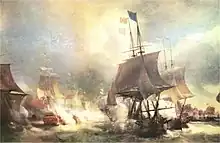 In his capacity as senior admiral he was president at the court martial of Admiral Augustus Keppel, which was held at Portsmouth in January 1779. He tried to avoid the duty, pleading poor health, but was compelled to take part.[1] Keppel was being investigated for his actions during the Battle of Ushant, which had taken place on 27 July 1778. His subordinate, Admiral Hugh Palliser had brought charges of misconduct and neglect of duty, which the court was compelled to examine.[7] The court was convened aboard HMS Britannia on 7 January, though the rest of the hearings were held at the house of the governor of the garrison.[7] After deliberations, the court returned its verdict on 11 February, unanimously acquitting Keppel, with Pye returning his sword with the observation that '...you will be called forth by your Sovereign to draw it once more in the defence of your country.'[7][lower-alpha 1]