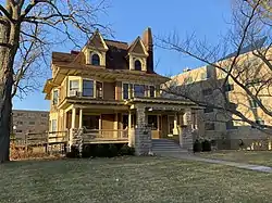The Thomas R. Wall Residence was built between 1898 and 1900 by the prominent local architect William Waters.[2] In 1855, Thomas Wall's father came to Oshkosh and joined other industrialists in establishing the local lumber industry. Upon his death in 1896, the oldest of Wall's sons, Thomas and James took over the family businesses. It was around this time that the house was built. Wall, who by 1928 had held positions as president of the Commercial National Bank of Oshkosh, and board member of multiple lumber companies left the house. He eventually sold to his son-in-law, Oshkosh businessman Morgan Davies. Wall had moved from the city to a country home in Windemere, on Lake Winnebago, where he died later in 1928.[2] Davies, who was closely associated with the Morgan Co., a sash and door factory in the city, lived in the house until 1930–31. The house was again sold, to John H. Bartlett, Jr. of the Oshkosh Trunk Co. In 1947 the residence was purchased by the university and used in various functions. It is currently used as the Multi-Cultural Education Center, which it has done so since 1972.[2][4] The house began to deteriorate, and by the 1990s, the university planned to demolish it due to “termite infestation and bad drinking water”. Chancellor Dr. Richard Wells decided against those plans and a committee was formed to save the residence. The committee eventually secured the funds to update the residence as well as make it compliant with the Americans with Disabilities Act. The Thomas R. Wall Residence remains as one of the few examples of architecture from the early lumber mill period in Oshkosh. It now stands alone amongst the many modern buildings constructed for the university, including in the shadow of the Taylor Residence Hall. The current capacity of the residence allows for free entry and use by university students, staff, and the community.[5]