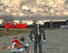 The enemy designs were drafted quickly, going from idea directly to design drawing without any rough sketches.[7] Anticipating that foreign markets, particularly Germany, would require the violence be toned down, they built in an option for operators to change the color of the game's blood, with green, purple, and blue available in addition to the traditional red.[7] To avoid potential controversy the developers removed an elderly looking female zombie, and several enemies dressed in suggestive attire.[7] The Chariot was animated by using motion capture with an actor wielding a broom, but the other enemies were all animated manually, using motion capture for reference only.[7]