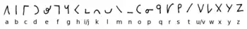 The vowels were designated by the height of the following consonant. Thus the B symbol with the L symbol written directly above meant "ball", while the B symbol with the L symbol below meant "bull". The B symbol with the L symbol on top right meant "bell", in the middle right "bill", below on the right "boll". A vowel at the word end was designated by a point in the suitable position. For initial vowels there were additional symbols. There were other symbols for frequent prefixes and suffixes as well as for consonant connections.