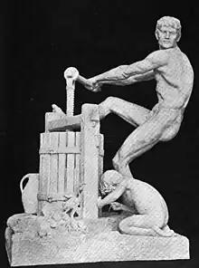 Clarke debuted a plaster sculpture group, The Cider Press, at the Paris Salon of 1892.[2] It depicts a muscular father pressing apples while his young son samples the juice. Clarke designed it to be a public drinking fountain, with water to flow out of the press and into a bucket at its base.[lower-alpha 2] The Cider Press was exhibited at the 1892 Historical American Exposition in Madrid, at which King Alfonso presented Clarke with a medal (the only one awarded to a foreign sculptor).[1] A larger-than-life-size bronze version was cast in Paris by Jaboeuf & Bezout Fondeurs,[5] and exhibited at the 1893 World's Fair. The following year, it was exhibited at the California Midwinter International Exposition of 1894, in San Francisco. The Exposition's Executive Committee purchased the sculpture and presented it to the city.[5] It was installed as a drinking fountain in Golden Gate Park in 1894.[5] Vandalism caused it to be relocated to the grounds of the De Young Museum.