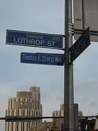 In 2006, at a celebration for his 80th birthday, the University of Pittsburgh renamed one of its newest medical research buildings the Thomas E. Starzl Biomedical Science Tower in recognition of his achievements and contributions to the field.[27] On October 15, 2007, the Western Pennsylvania American Liver Foundation and the City of Pittsburgh honored Starzl by dedicating Lothrop Street, near his office and the biomedical research tower bearing his name, as "Thomas E. Starzl Way".[28]