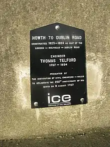 In 1809, Telford was tasked with improving the Howth Road in Dublin, to connect the new harbour at Howth to the city of Dublin as part of wider plan to improve communication between Dublin and London.[3] The milestones that are a feature of this route from Howth to the GPO on O'Connell Street still mark the route.[4] He also drafted the first design of the Ulster Canal.[3] Irish engineer, William Dargan, was trained by Telford.[5]