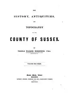 Horsfield compiled for John Baxter The History and Antiquities of Lewes and its vicinity (with an appendix, an Essay on the Natural History of the District by Gideon Mantell), two vols. Lewes, 1824โ7. This was followed by a more major undertaking, The History and Antiquities and Topography of the County of Sussex, two vols. Lewes, 1835. For the first volume, which contains East Sussex, Horsfield was assisted by William Durrant Cooper; the second volume, on West Sussex, is mainly an abridgment of the histories of James Dallaway and Edmund Cartwright (1773โ1833).[2]