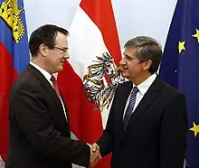 At the 2013 parliamentary election, Zwiefelhofer was the Patriotic Union’s candidate for Prime Minister. The Patriotic Union came in second to the Progressive Citizens' Party.[1] However, the two formed a grand coalition, and as a result, Zwiefelhofer became the Deputy Prime Minister in the Cabinet of Liechtenstein until 2017.[2] Additionally he also served as Minister of Home Affairs, Justice and Economic Affairs.