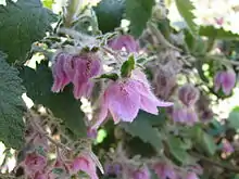 Thomasia macrocarpa is a small, spreading shrub growing to about 1.5 m (4 ft 11 in) high and 1 m (3 ft 3 in) wide. The stems are hairy, the grey-green leaves 30–120 mm (1.2–4.7 in) long and 15–70 mm (0.59–2.76 in) wide with finely toothed margins and star-shaped hairs. The leaves are heart to egg-shaped, velvety when young and become smooth as they age. The conspicuous pink to purple flowers are produced between August and November in the species' native range. Occasionally white flowers are seen. The flowers are about 10 mm (0.39 in) in diameter with a perianth consisting of two bracts and the pedicel 7–15 mm (0.28–0.59 in) long. The flower petals are small lobes and the surface is covered in star-shaped hairs. The flowers are followed by capsules containing black seeds which are shed from the plant when ripe.[2][3]